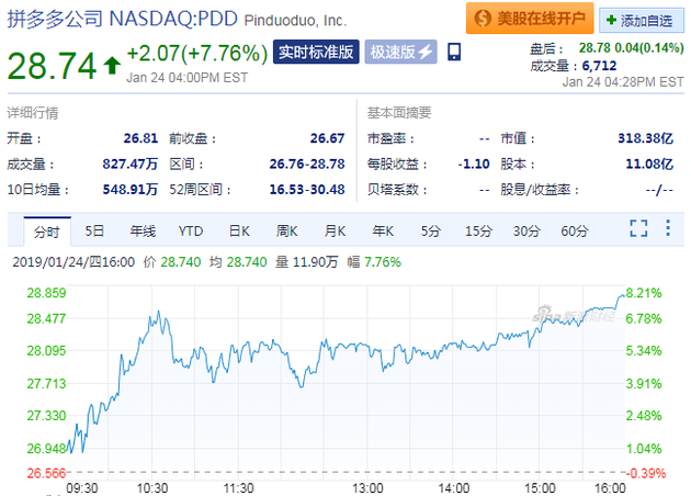 拼多多周四股价大涨,到收盘,拼多多报28.74美元,涨幅达7.76%,市值318.38亿美元。拼多多市值重回300亿美元的一起也简直与京东319.74亿美元的市值相等。