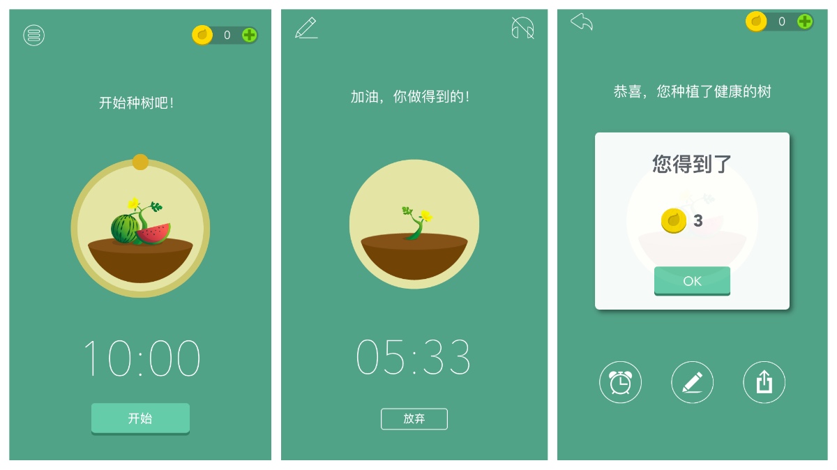 ,这款App会用游戏的方法“强制”你脱节手机。运用时,你能够挑选自己期望专心的时刻——10分钟到2小时以内,然后点击“开端”,之后你有10秒的时刻能够挑选撤销。而一旦实在开端之后,你就会在虚拟森林种下一颗种子,假如在设定的时刻内你一直在Forest界面,没有翻开其他运用,这颗种子会长成一棵树,你也会得到必定的金币奖赏;反之树木会干枯,你无法得到任何的金币奖赏。比方,接连专心10分钟,你就能够得到3个金币。通过测验,种树过程中接听电话不会影响树苗生长。